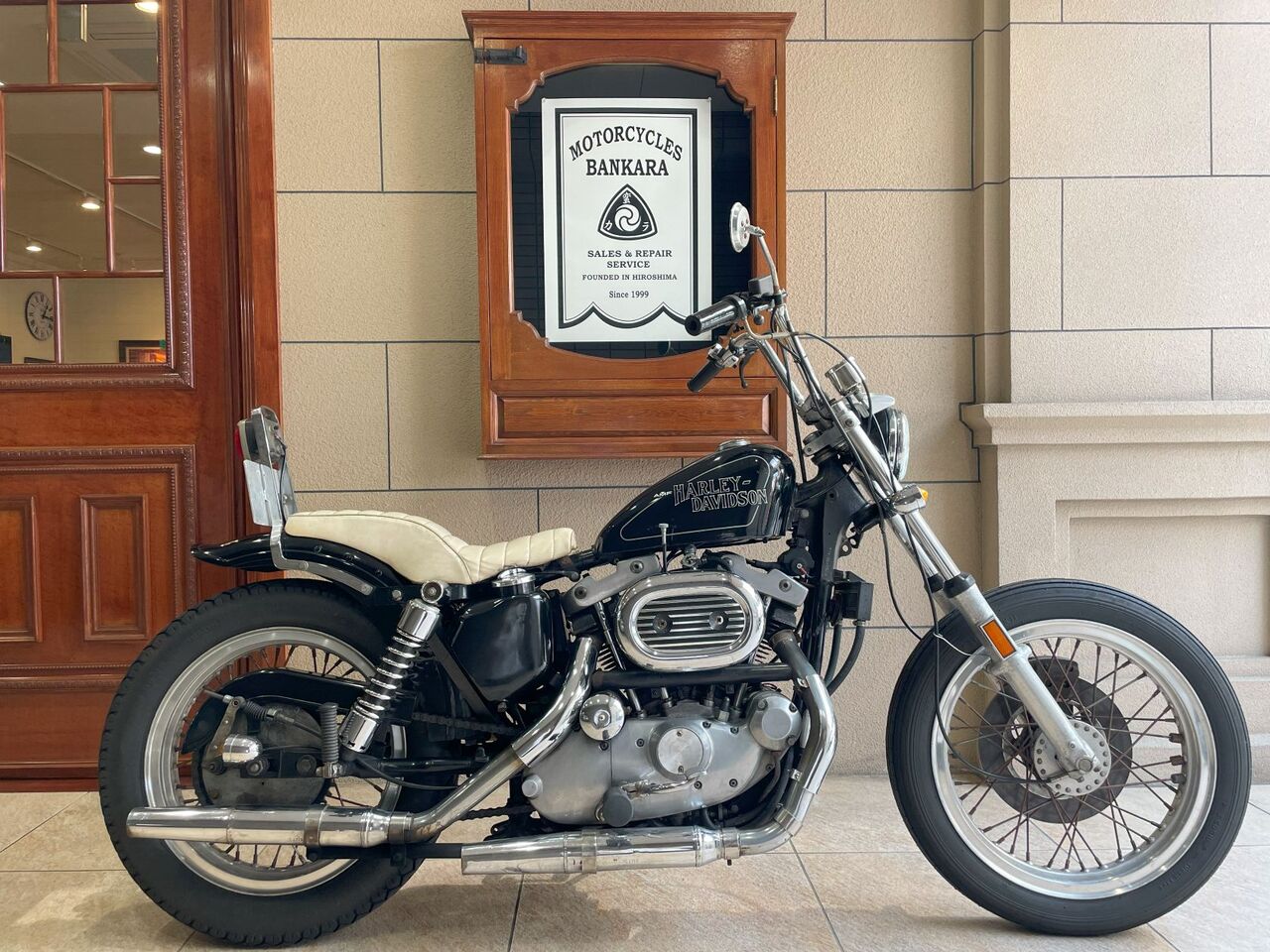 先ずは少し前に入荷した’77XLHカスタムです。こちらのアイアンは過去バンカラ社長がカスタマイズした車両です。しっかりと作り込んだワンオフパーツがリア周りをコンパクトに纏めすっきりした印象のスタイルとなっています。厚みのあるスタイリッシュな白いシートはロングツーリングにも向いてそうですよね~。